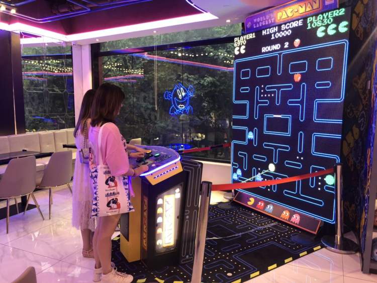顺着楼梯直达二楼,便是街机游乐区以及餐饮区,一上楼小编就看到了传说中复刻童年经典的游戏街机,它的Size比印象中的街机大了不少。据服务员称,晚上或者周末来玩的人特别多,通常要排半个小时或者一个小时才能轮到。