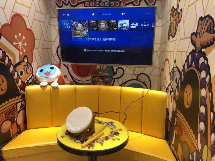 二楼的角落也别有一番天地,这里被设计成太鼓达人场景,还有一台太鼓达人游戏机。该游戏需要玩家配合屏幕上流动的音符,以日本传统乐器"太鼓"为媒介,打出正确的节奏。不过依旧是老问题,由于总是反应不过来,小编敲了几次都没有过关,手都敲麻了,还被朋友戏称是“敲木鱼”,内心也只能呵呵呵呵呵了。