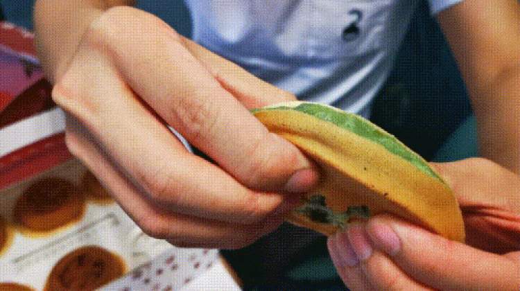 饼皮分开后,里面的馅料瞬间溢出来。抹茶的绿色搭配蜜豆的红色非常养眼。蜜豆被压得非常细腻,入口还能感觉到沙沙的口感。搭配抹茶的清香味道,绝对能成为你一整天的快乐源泉。