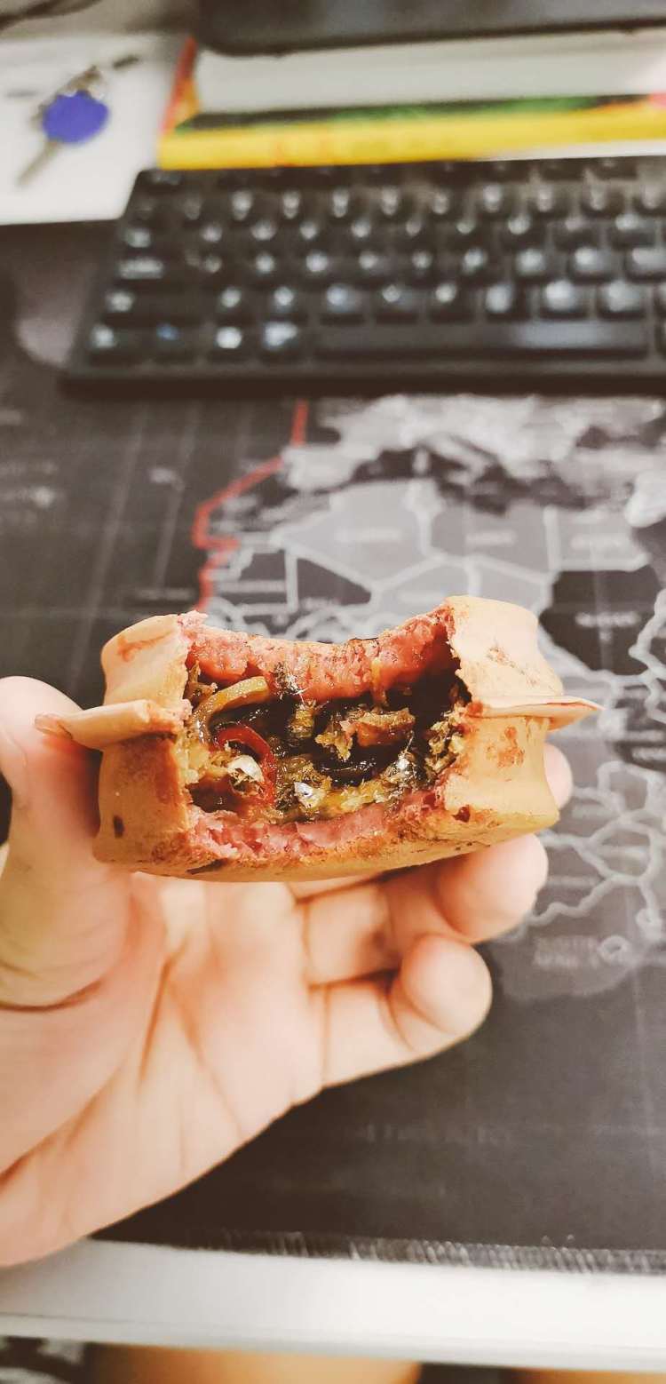 在谈论馅料之前,首先我想为这个饼皮吹爆彩虹屁。车轮饼的饼皮非常Q弹,入口嚼劲十足。当然,Q弹的饼皮也给我们测评带来了一些困难——因为不好掰,要通过撕拉才能把饼分成两半。