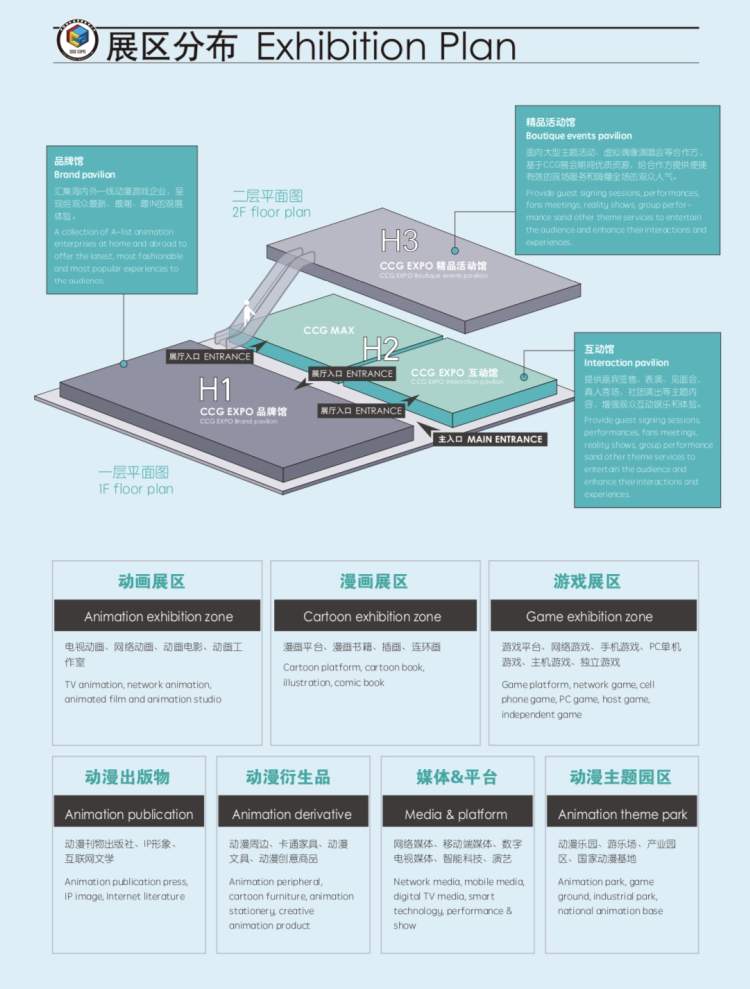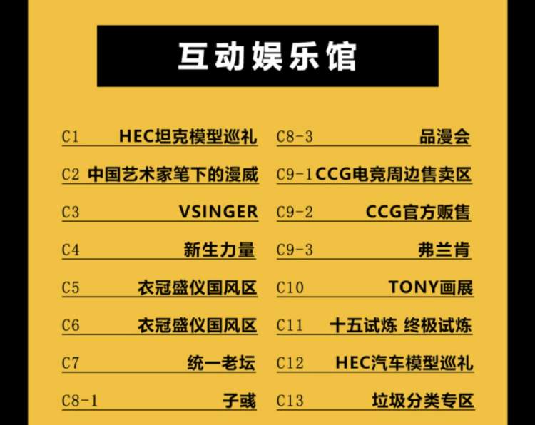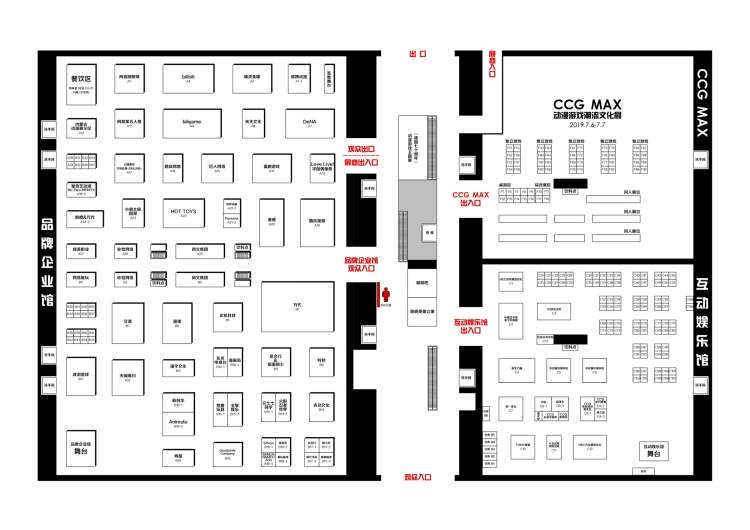 本次展馆平面图,本届展会展区面积6万平方米,公众板块分为两大馆,品牌企业馆与互动娱乐馆,两馆共同开放五天。