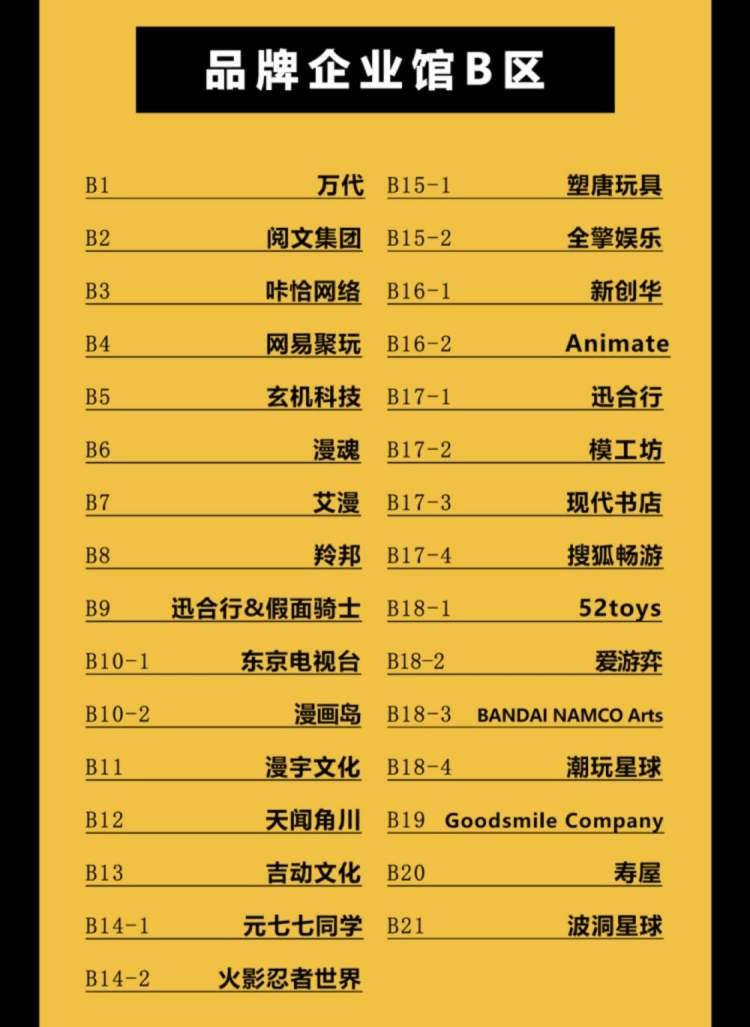 品牌企业馆A区、B区集结了迪士尼漫威、万代、bilibili、腾讯视频、阅文集团、小明太极国漫、寿屋、天闻角川、HOT TOYS等众多海内外品牌企业参展。