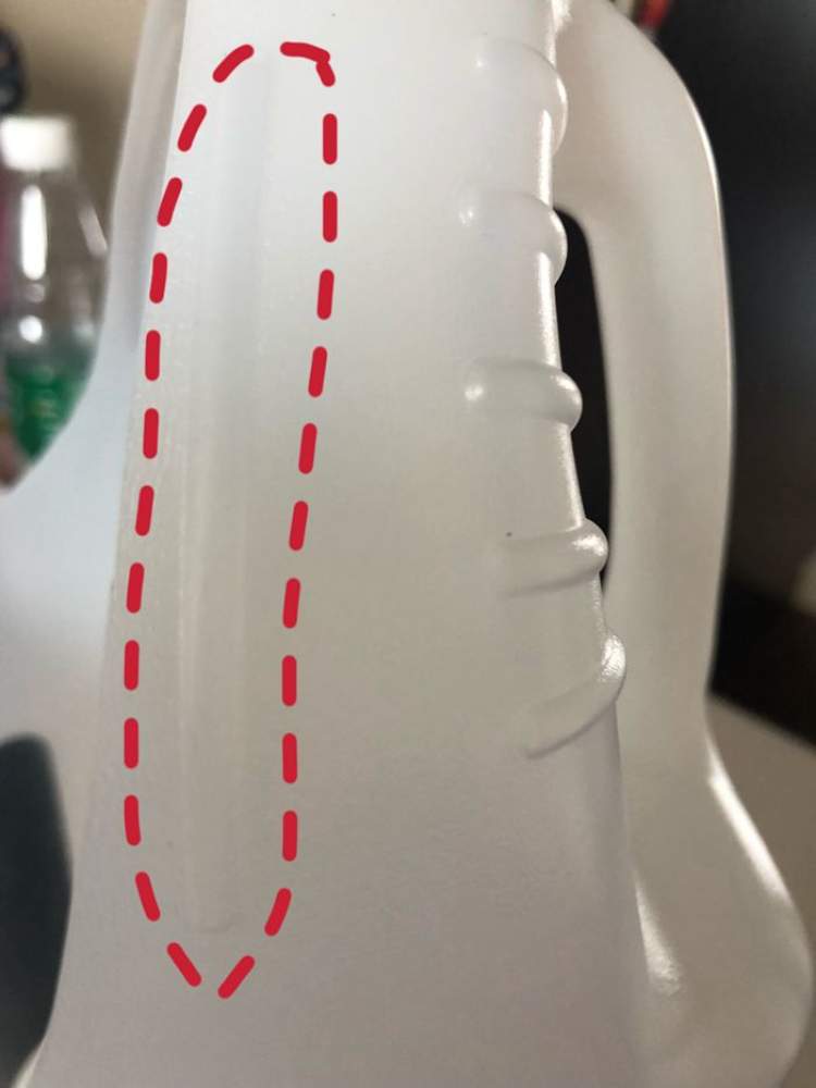 “你看,这桶体上本身就有四道凸起纹路,这凸起纹路很重要,一方面可以用作画线的标尺,另一方面和盖子上的凸起可以重合,让盖子与主体贴合严密”,严幼馨边说边剪,从水嘴口的四分之一处往桶体处剪,在桶的左右两侧慢慢建成弧形,最后将水桶剪出了一个类似水滴形的空缺。