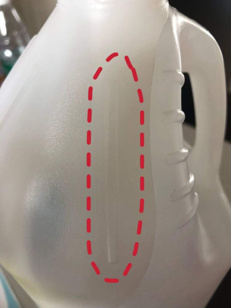 从第二个空桶的水嘴处下手,同样以左右两个凸起纹路为基点,严幼馨打上了两条基准线。“刚才的瓶体基准线离凸起纹路大概0.5毫米的样子,这个盖子的基准线就要离凸起的纹路1厘米左右,这样才能保证瓶盖盖上去的时候,左右两处的凸起可以重合,盖子不容易掉落,而在盖子外缘与桶体重合的地方,也需要留有两到三厘米的重合,这样盖子和桶体才能密闭良好。”