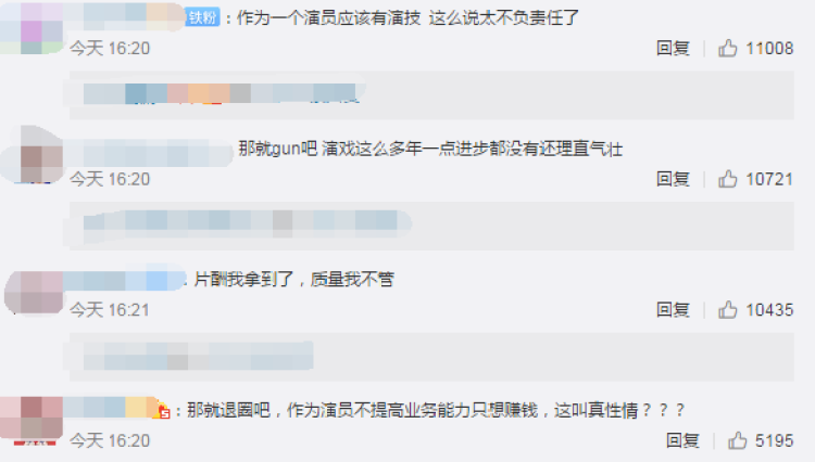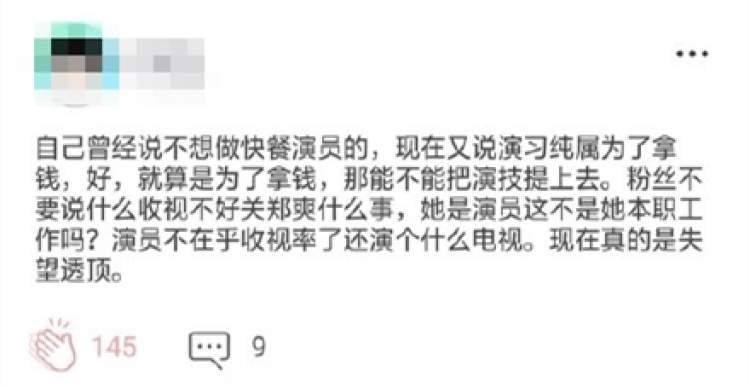 这几句话迅速引发争议:作为一个演员,郑爽的人生当然不止电视剧,但有粉丝认真期待作品,有导演、编剧、摄影、服化道等等整个团队为作品努力,还有电视台、视频网站掏钱买版权,她怎么能轻巧地说“失败成功都是自己的事”?或者说,把表演工作简单地等同于“赚钱”,是不是对自己的职业太缺乏尊重了?