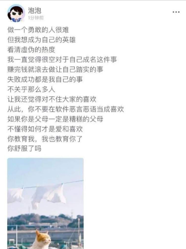 在另一条发布中,郑爽说对于自己成名这件事感到“很空”,“赚完钱就滚去做让自己踏实的事,失败成功都是我自己的事,不关乎那么多人”。