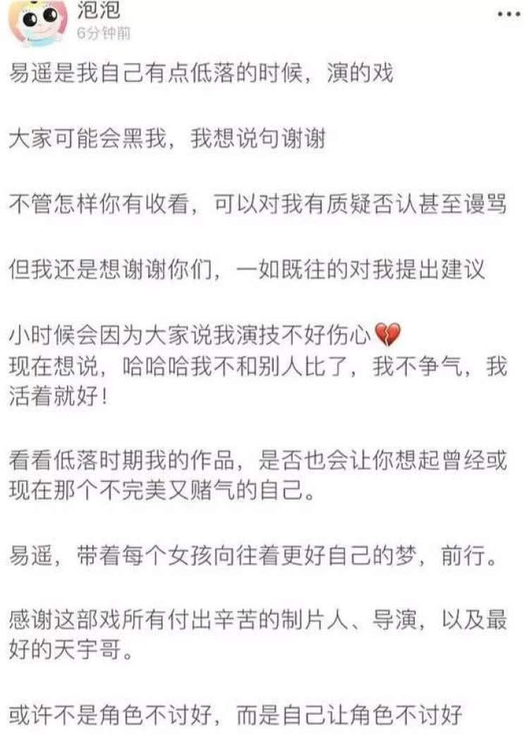 对此,郑爽显得不太服气。开播没多久,她就在自己的粉丝APP上回应,易遥这个角色是在她情绪低落的时候演的,“或许不是角色不讨好,而是自己让角色不太好,该哭的时候哭不出来,该笑的时候又笑的(得)难看”。