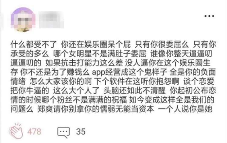 随着批评声越来越多,郑爽再次回应,称自己情绪低落,“也许有些人又会吐槽,我天天不务正业,净说些没用的话,可我想说你真的抑郁症过么?自闭过么?你知道你在说这样的话的时候会使当事人更加逼自己到绝境而已”。