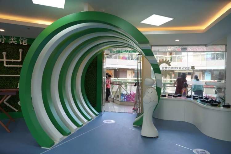 垃圾分类体验馆的大门是一条特别醒目的时光隧道,主色为绿色和白色,倡导绿色生活为理念。