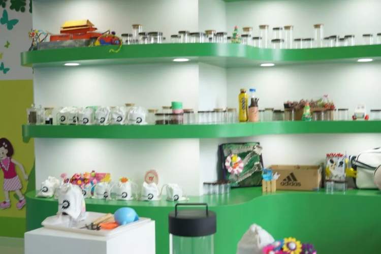 这么多瓶瓶罐罐放在这里装什么呢?这些瓶子里装着的是厨余有机肥料。那么,这些肥料是如何产生的?答案是环保生物厨余机!通过对厨房剩余食物进行无害化的处理,产生有机肥用于展馆中的的小花园。这些有机肥还会作为参观者的礼物赠送。