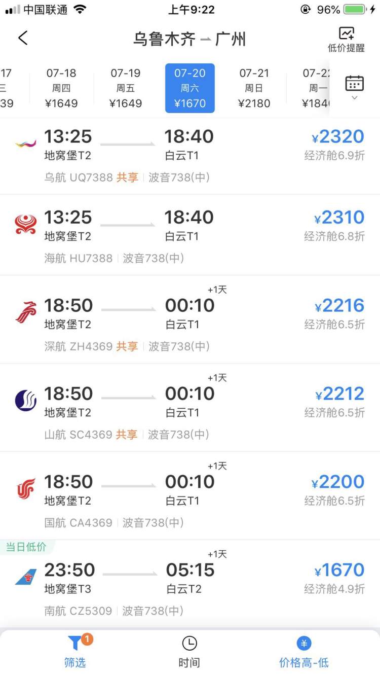 同样,7月20日,乌鲁木齐飞广州的夜航航班也能节省五六百元。