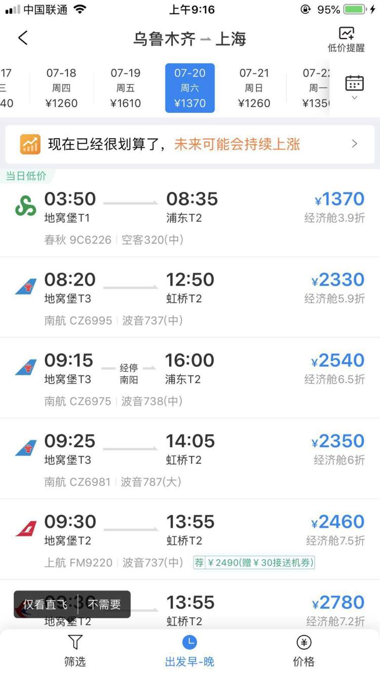 今天,晨报周到记者通过携程APP搜索获悉,7月20日周六从乌鲁木齐飞上海浦东T2,春秋9C6226航班(03:50-08:35),经济舱打3.9折,票价为1370元,相较于白天航班价格可剩下一千元左右。