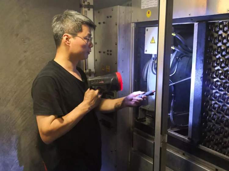 为应对即将到来的大热天,上海地铁工作人员针对空调系统管路的每一个接口,使用专用泄漏探测仪进行泄漏检测,对空调系统制冷剂称重、加液,确保每一台空调拥有足够的制冷动力。