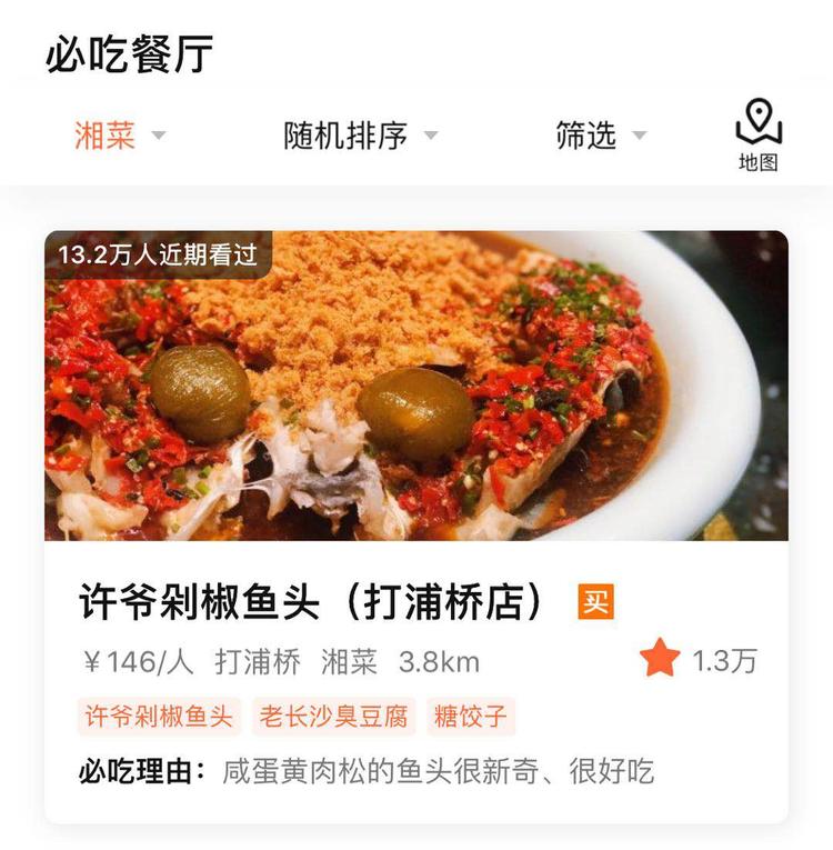 目前,湘菜类别下,仅有一家餐厅——许爷剁椒鱼头。大家不妨去尝试一番,用味觉记住湘菜的味道,也不枉必吃榜的用心良苦了。