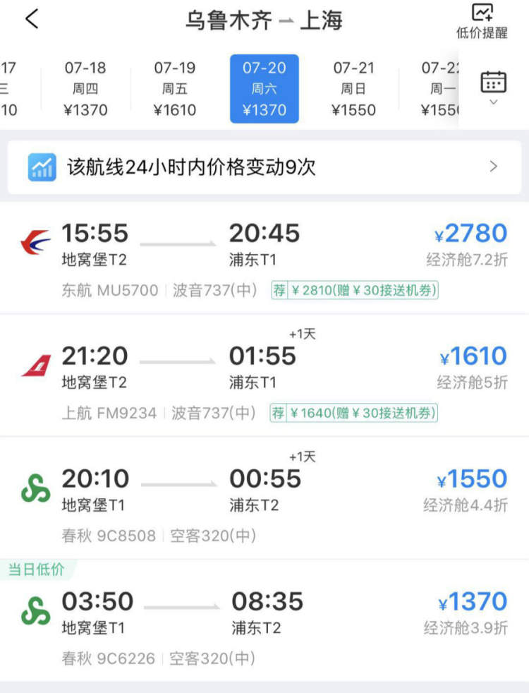 对于,旅客来说,增开夜间航班也能多一种选择,关键是价格在暑运期间也颇有竞争力。记者通过查询携程APP后了解到,如7月20日周六从乌鲁木齐飞上海浦东T2,春秋9C6226航班(03:50-08:35),经济舱打3.9折,票价为1370元,相较于白天的直飞航班,可省下1410元,比白天执飞的经停航班也便宜了近千元左右。