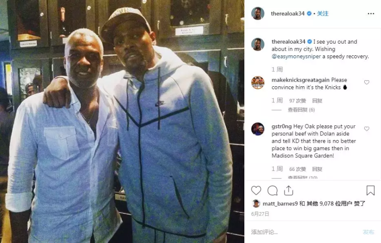 有趣的是,养伤期间杜兰特就住在曼哈顿,尼克斯名宿奥克利特意前往看望,还对他进行鼓励。在社交媒体上,他也贴出了自己与杜兰特的合影,底下的网友纷纷劝奥克利忘记与多兰的仇恨,帮助球队对杜兰特进行招募。