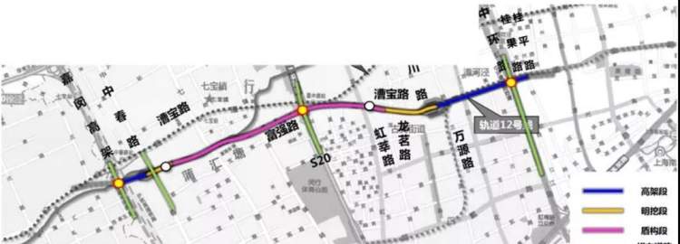 施工时,主要采取高架、明挖、盾构等三种方式,其中中春路以东至虹莘路为地下段。全线共有五个口子可以上下:嘉闵高架、外环、中环三个立交及中春路、虹莘路附近的两个匝道。