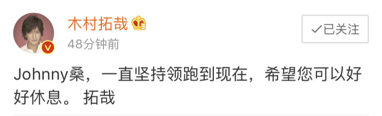 喜多川去世消息传出后,木村拓哉昨晚也在微博表达了自己的哀思。