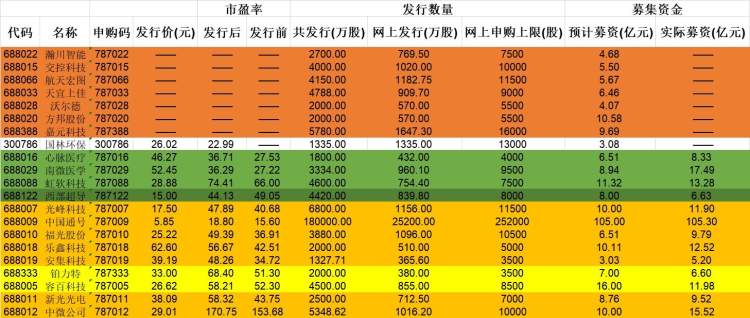 本周23只新股申购,除宏和科技、国林环保外,其余21只均为科创板股票。23只新股在一周之内密集发行。按首发家数统计,这比今年5、6两个月的新股还多。今年5月、6月IPO分别为9家、11家。