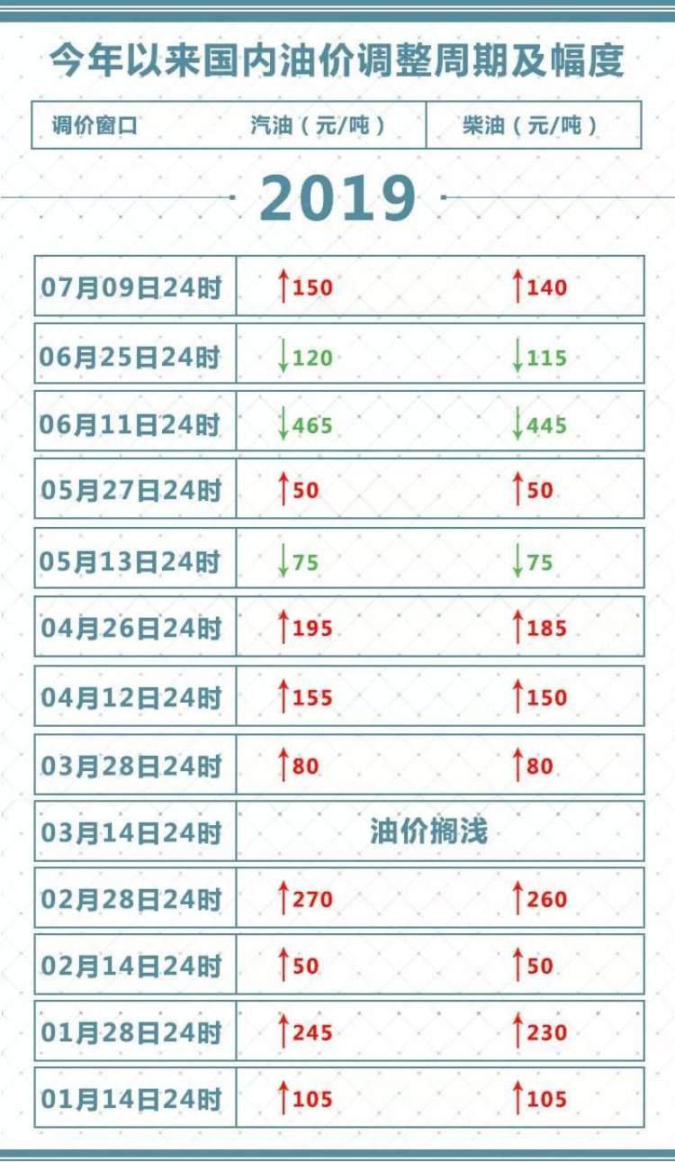 今天,记者特地把今年的油价调整表翻出来,计算了一番。2019年以来,国内成品油市场共历经13次调价,呈“九涨三跌一搁浅”态势,充分地利用调价窗口加油,车主可以节约将近80元,当然在涨价前,车主要去及时加油,而降价前,车主可以等一等,每次踏准节奏,积少成多,就可以加菜了。