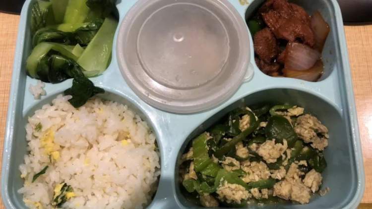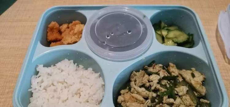 一荤两素,加上米饭、水果、酸奶。并不像平常概念里的减肥餐,鸡胸肉加上一堆草,这个荤菜可以是鱼香肉丝,也可以是鸡米花,有滋有味的,就是量被严格控制。