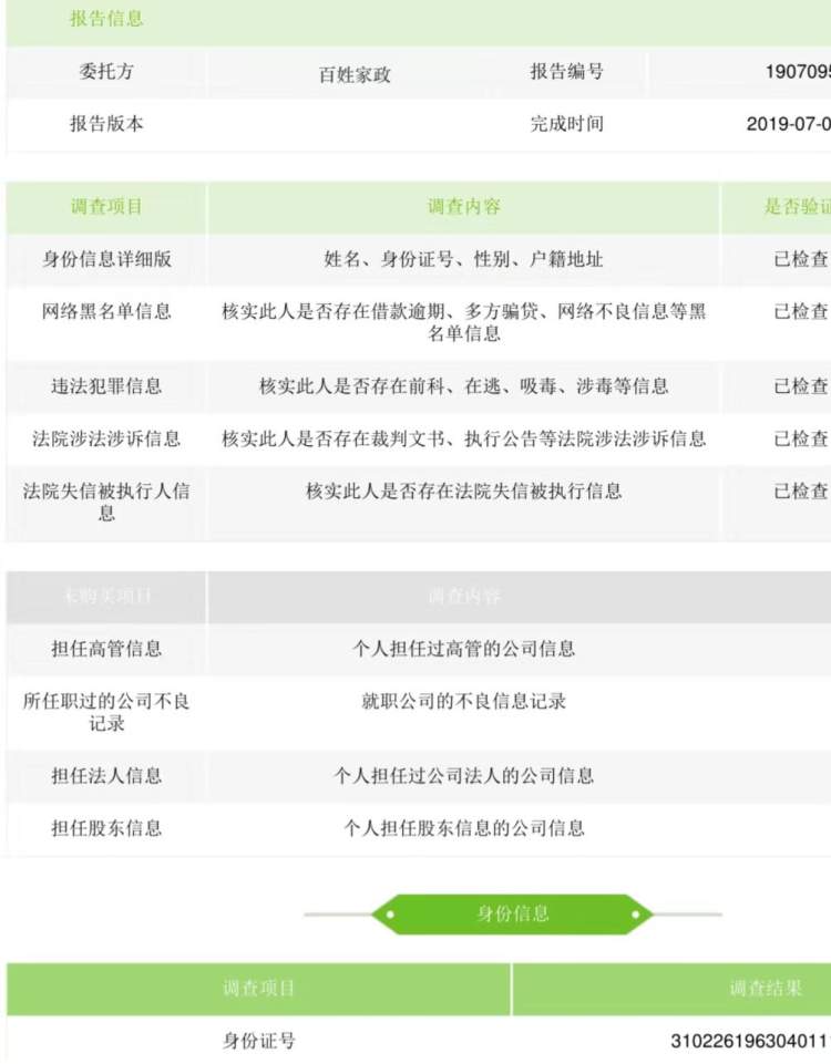 保姆干阿姨今年56岁,做保姆已经有近20个年头,之前在好多户家庭做过保姆,但来百姓家政找工作还是头一次。这次是雇主胡女士提出要求,想聘请一位住家保姆,最后经家政公司撮合,双方认可,胡女士考虑聘用干阿姨,但对于干阿姨的情况究竟如何心里没有底。家政公司也坦诚告诉胡女士,干阿姨是新来的保姆,他们只是听她自己说,未进行过身份、相关情况核实认证,为了打消胡女士顾虑,该家政公司对干阿姨进行了背调。