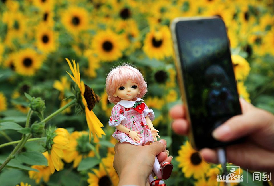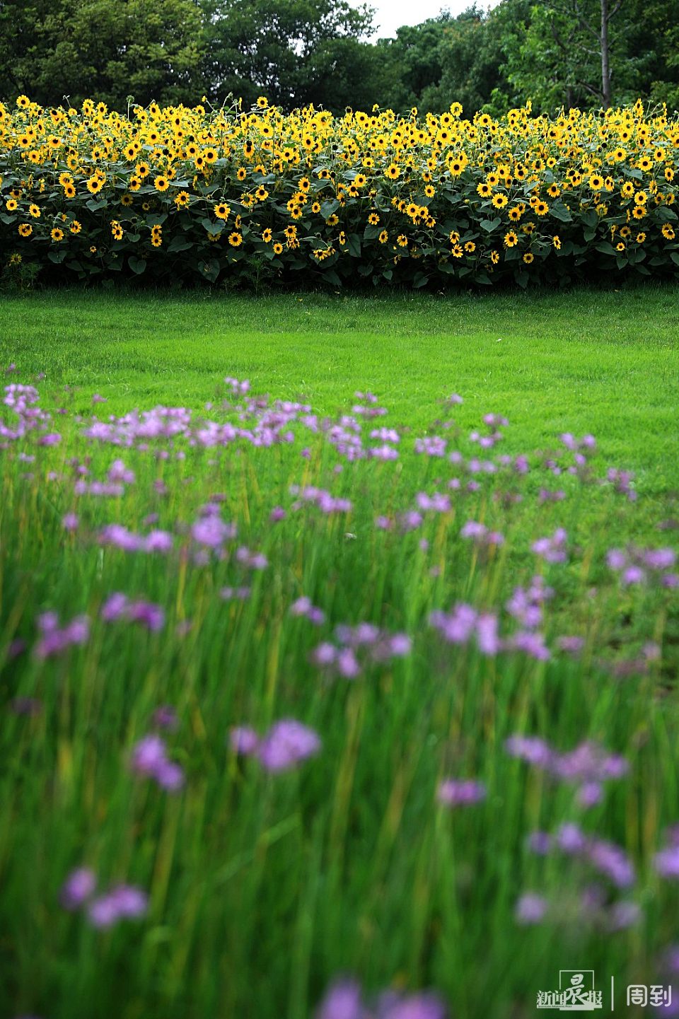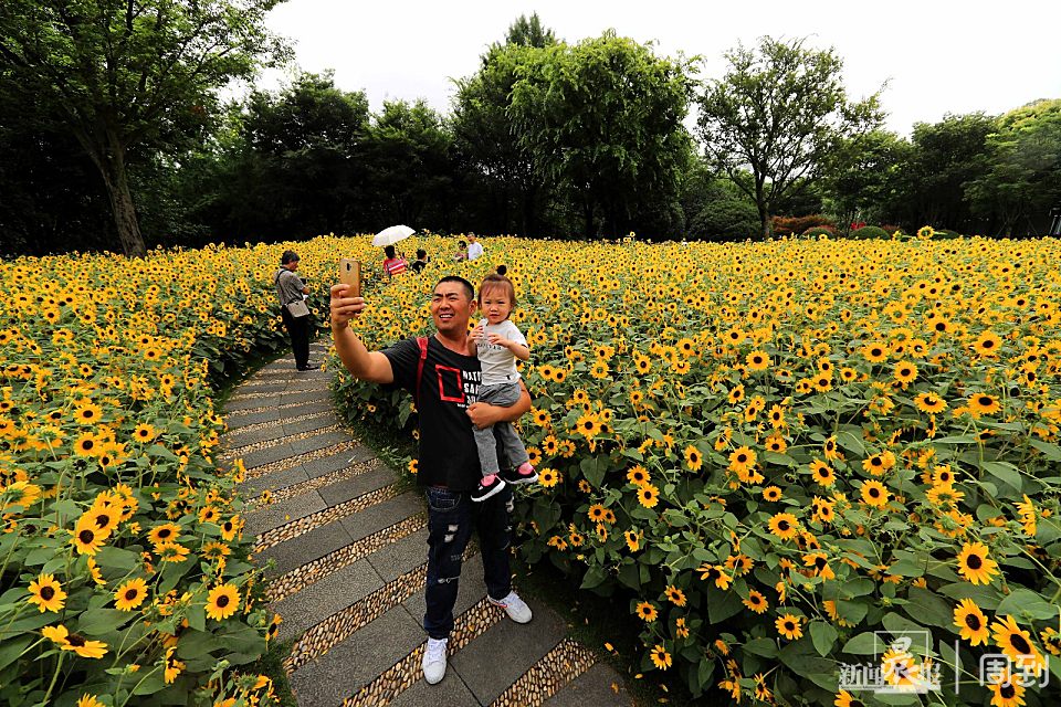 沿着花间小路慢慢前行,两旁金灿灿的向日葵缀满枝头。徜徉于成片的黄色花海,尽享明艳夏日带来的美感。