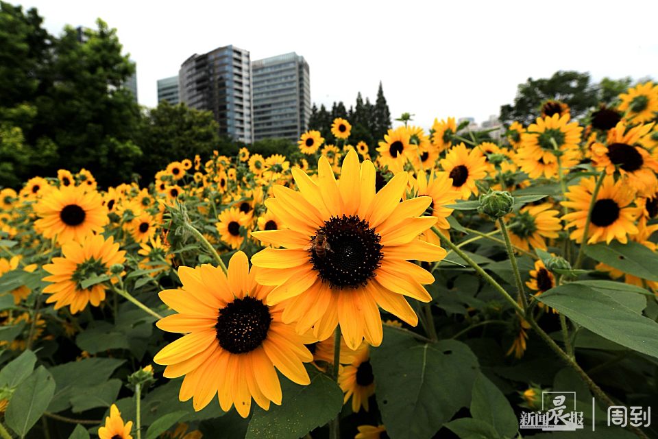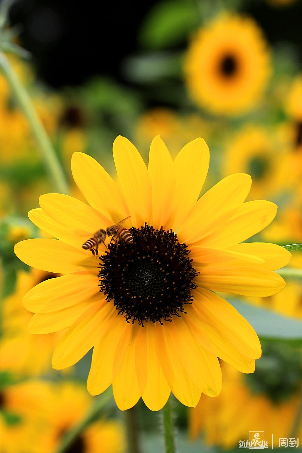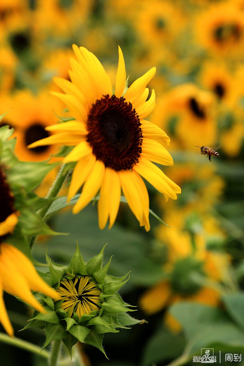 朵朵葵花竞相放,蜜蜂花间飞舞。这个场景就像一幅静谧的油画,又与周边的绿植景观带融合在一起,散发着自然的魅力。