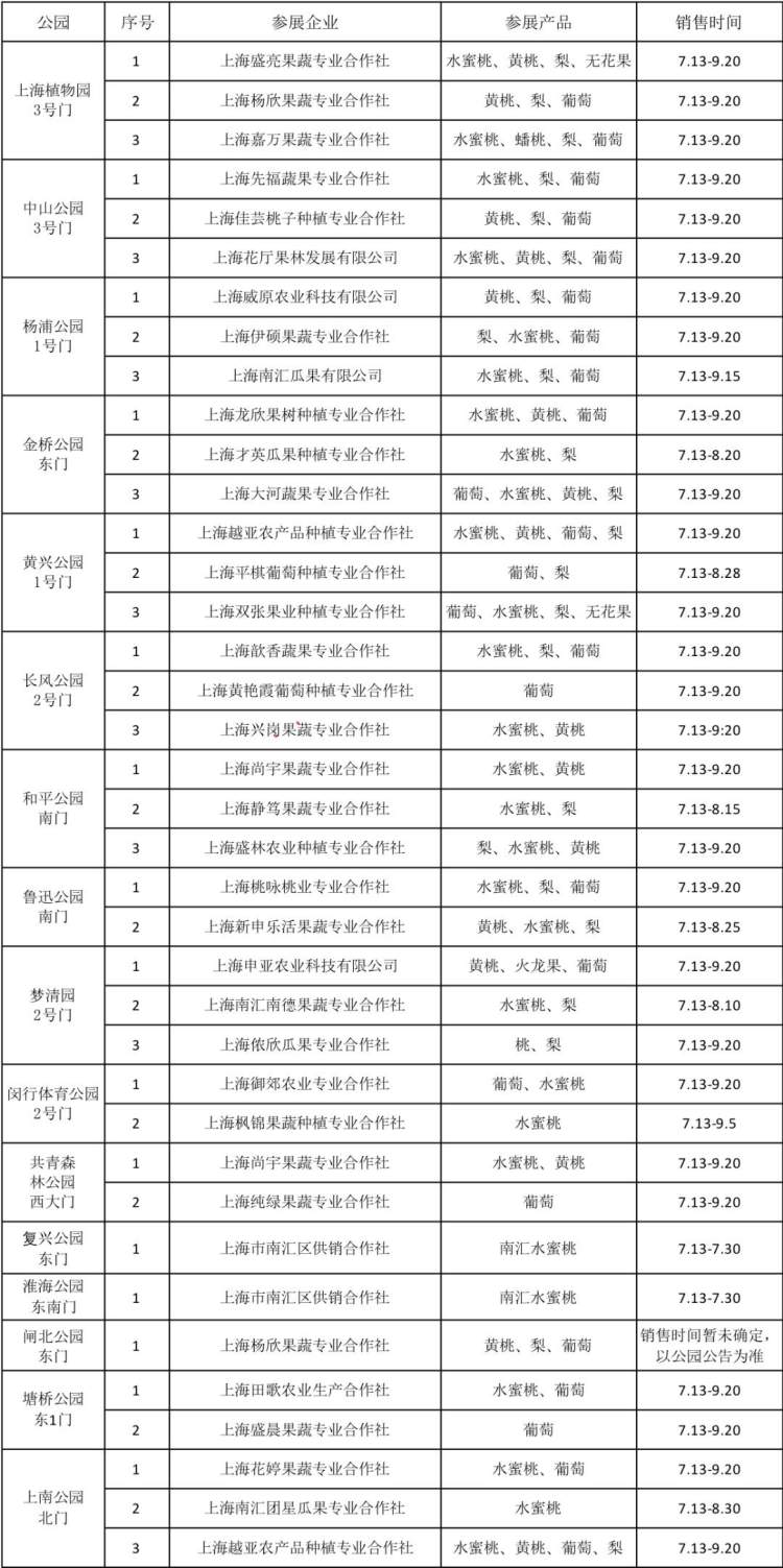 7月13日至9月20日(详见表格),每天早上6:00~10:00,在上海植物园、中山公园等16家公园销售新鲜地产优质水果。其中,7月13日至7月30日,在复兴、淮海、植物园、黄兴、杨浦、金桥、鲁迅、长风、梦清园、塘桥、上南等公园有“南汇水蜜桃”集中供应。