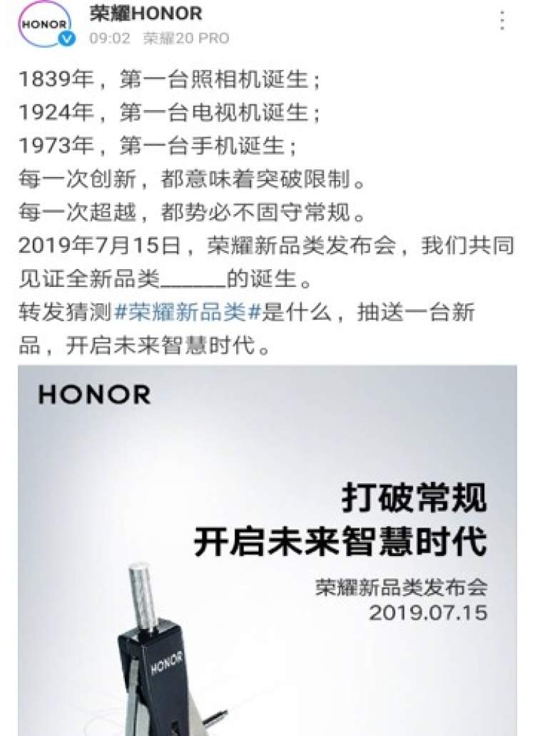 7月11日,荣耀官方发布新品海报,海报显示的是一个圆规,正在刻画一个七彩矩形。海报显示,荣耀新品发布会将于7月15日召开。