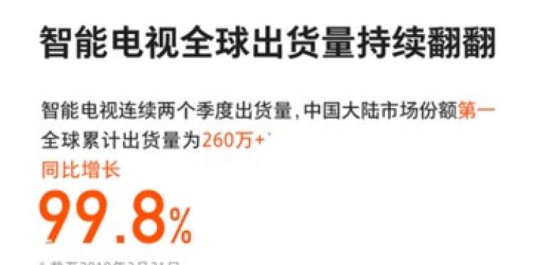 根据小米一季度财报显示,智能电视产品连续两个季度位居国内市场份额第一,全球累计出货量超过260万台,同比增长达到99.8%。