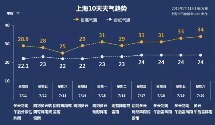 根据上海市气候中心最新预测:2019年盛夏(7-8月),上海平均气温为28-29℃,接近常年水平,但较近10年平均水平偏低。盛夏高温日数预计为10-18天,较近10年平均偏少。