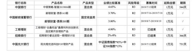 中国银行则推出了“中银策略-智富2019006期”理财产品,募集结束日为7月15日,该产品为混合类产品,起购金额为1万元,业绩比较基准为4.65%,风险等级为R3(平衡型),封闭期限为544天。