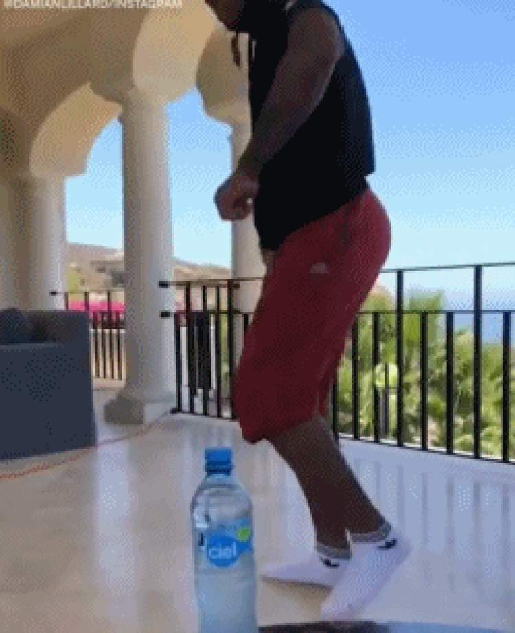 开拓者当家球星利拉德的技术明显不过硬,直接把整个水瓶都给踢翻。