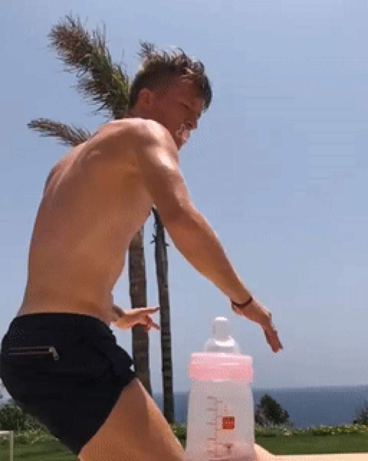 多特球星罗伊斯也完成了挑战,不过,成为新晋奶爸的他选择了奶瓶作为道具。