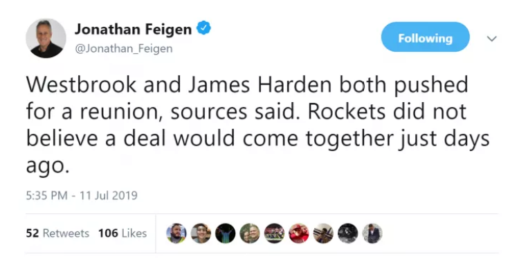 火箭随队记者费根随后确定了这一消息,并透露称这笔交易的促成一定程度上依靠着威少和哈登两人在幕后的推动,火箭方面在几天前根本不相信能交易来威少。