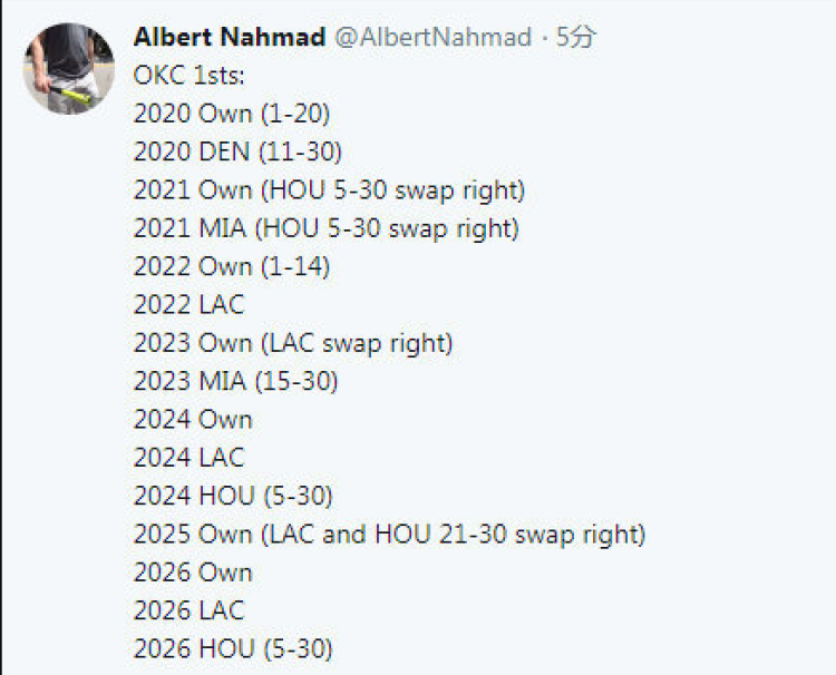 而雷霆这边,一周之内球队的目标从争冠转为了重建,从保罗·乔治的交易开始,他们不断积攒首轮选秀权,截止至威少的这笔交易,球队在未来6年将拥有15个首轮选秀签。
