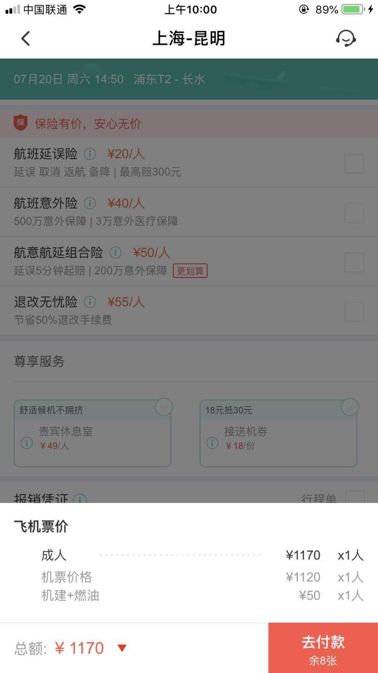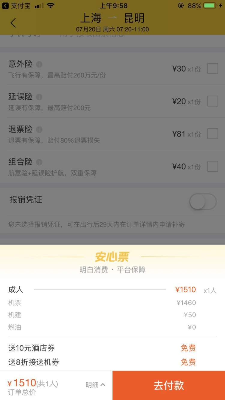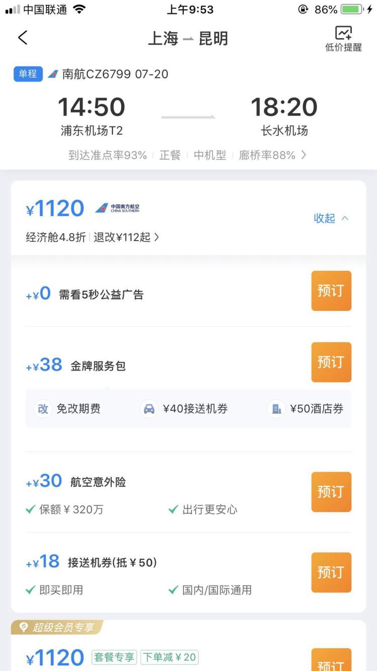 以上海至昆明的航班为例,选择其中的一趟航班,点击后显示四种预订选项。分别是:+0元(需看5秒公益广告)、+38元(金牌服务包)、+30元(航空意外险)、+18元(接送机券)。