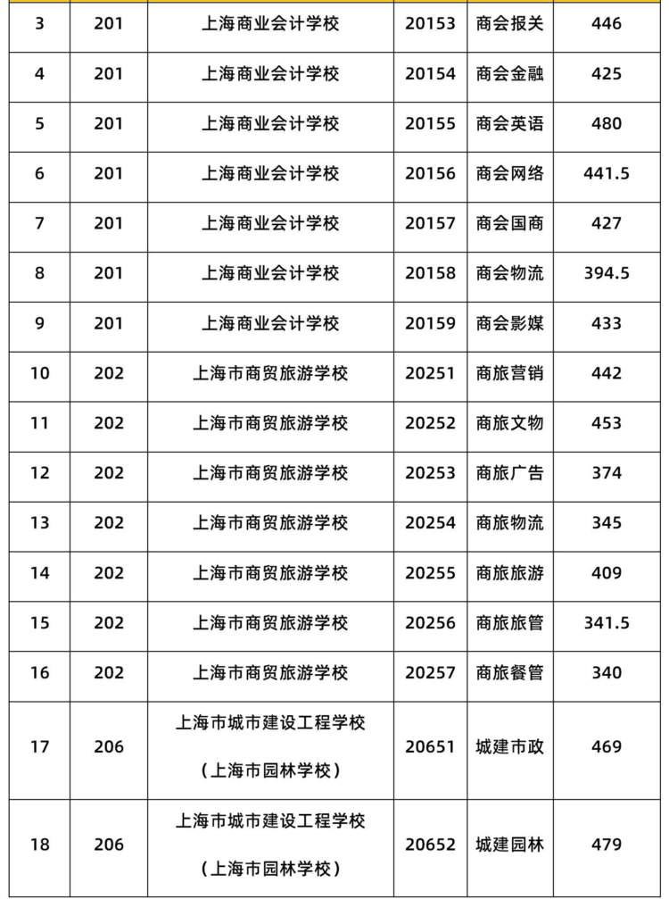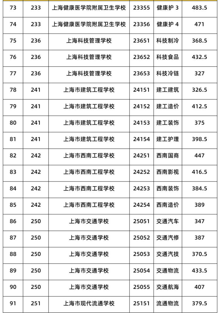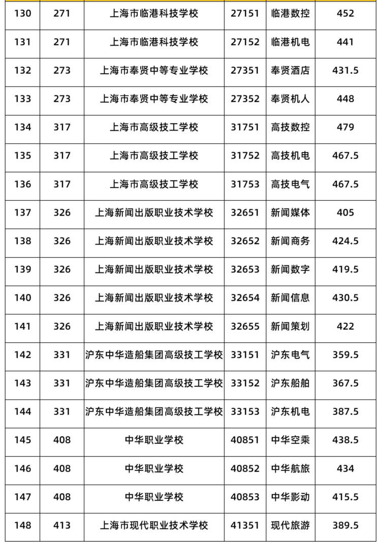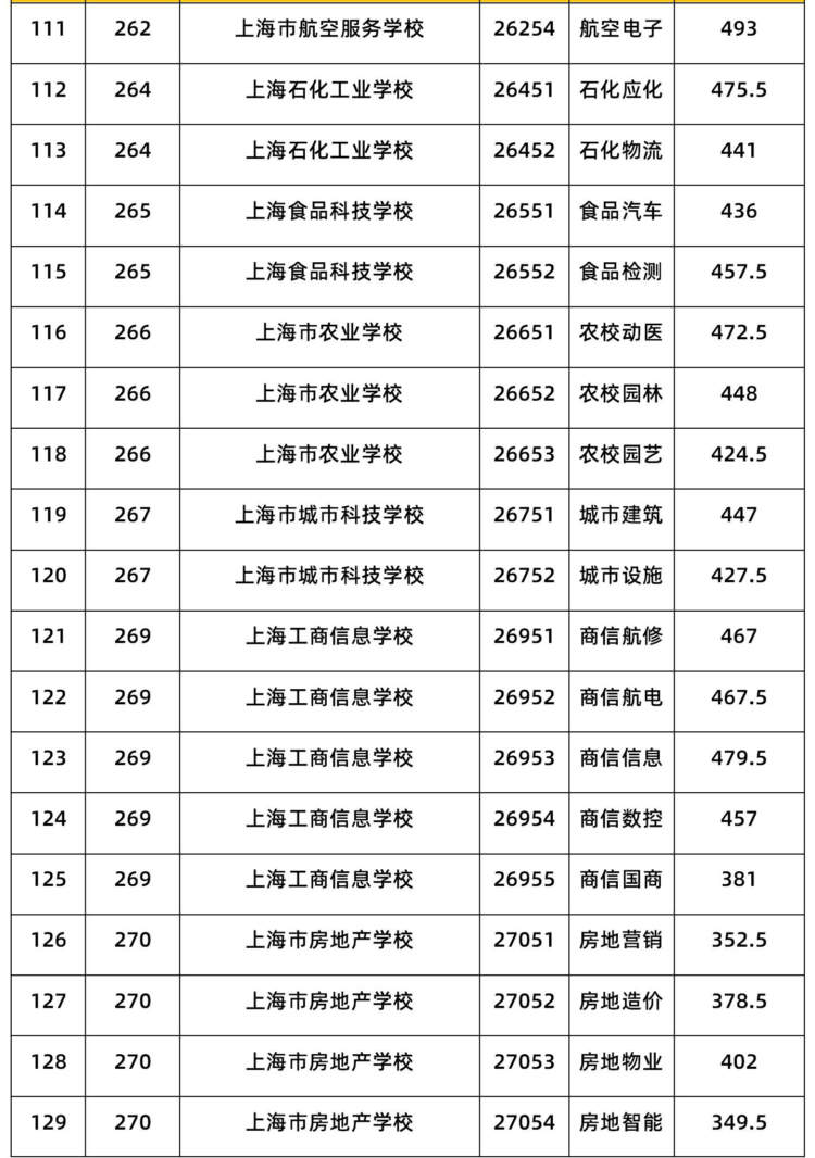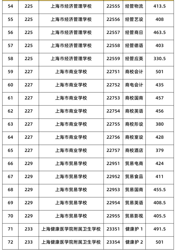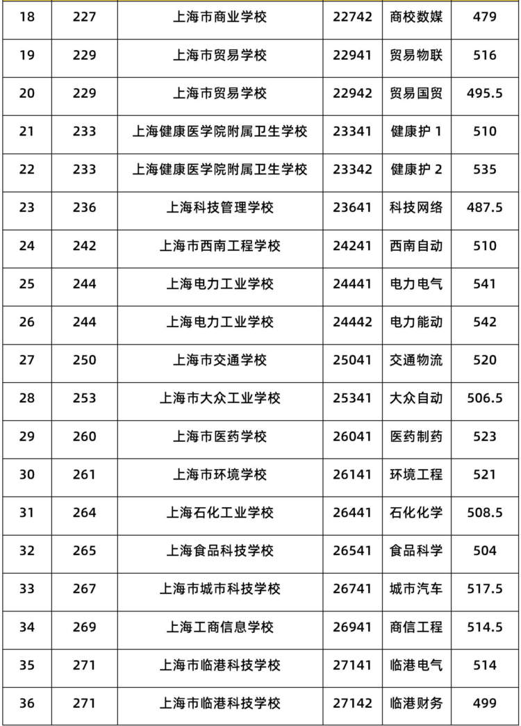 其中,上海电力工业学校的电力动能、电力电气以及上海健康医学院附属卫生学校的健康护2专业,分别以542分、541分、535分,列前三位,分别高出中本贯通最低投档控分线92分、91分和85分。