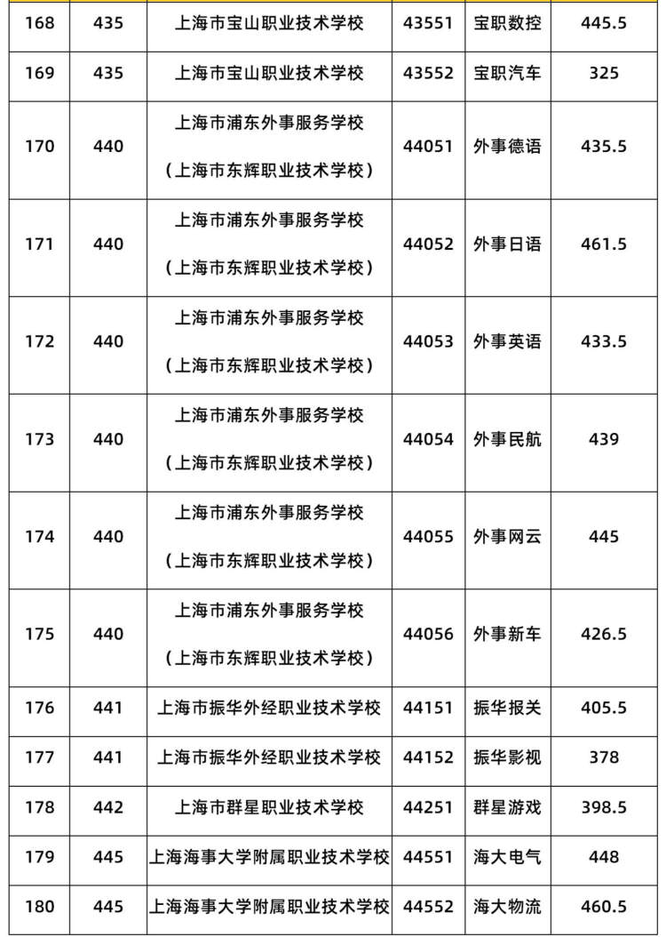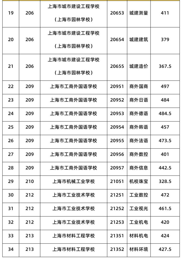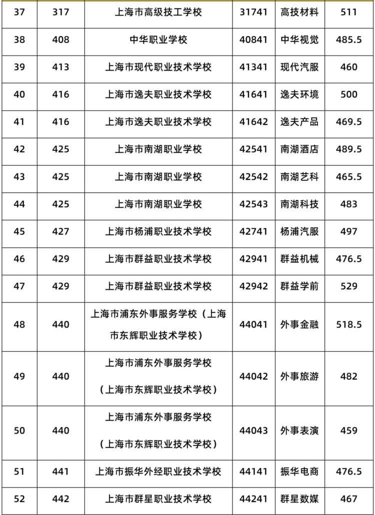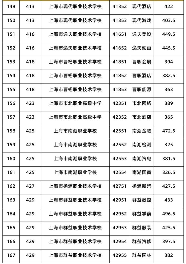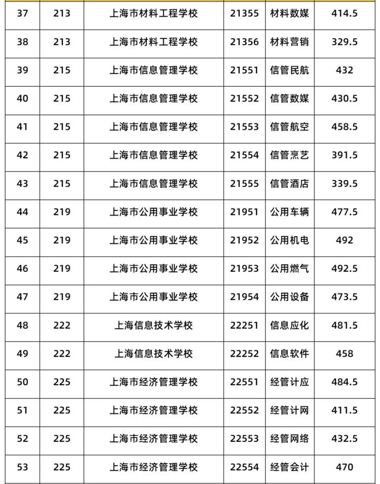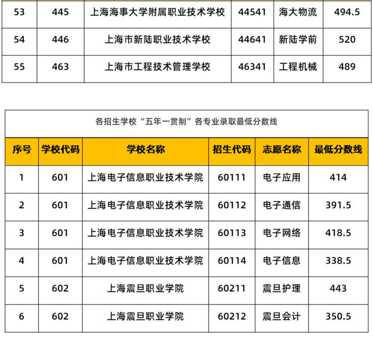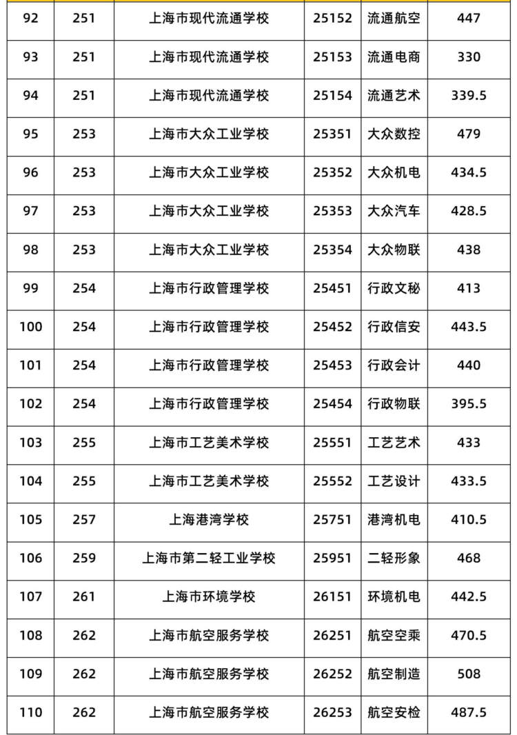 其中,上海电力工业学校的电力动能、电力电气以及上海健康医学院附属卫生学校的健康护2专业,分别以542分、541分、535分,列前三位,分别高出中本贯通最低投档控分线92分、91分和85分。