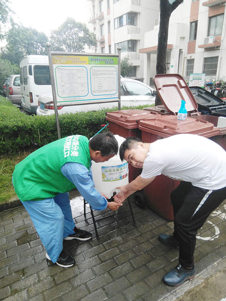 与原本繁琐的破袋步骤同时出现的问题是居民们在投放湿垃圾后的洗手需求,因为以往的破袋方式很容易让手接触到湿垃圾并因此弄脏,但是在157个点位中有103个是没有条件接水管安装洗手台的。从而导致居民们无处洗手。为了解决这一问题,街道在这些点位放置了便携式洗手桶,虽然只是一个简单的带有水龙头的塑料桶,但却马上就解决了居民们无处洗手的问题。记者看到洗手桶的容量很大,只需要放置在一个平台上即可进行洗手。每个放置洗手桶的点位都有专门的志愿者进行加水维护保证居民们的洗手需求。江湾镇街道用这样简单的便携式洗手桶填补了无法安装洗手台点位的空白,让居民们可以随时有水洗手。