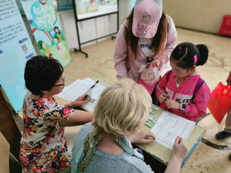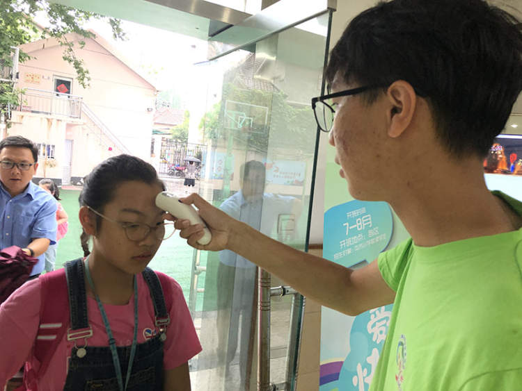 尽管暑托班是早上8点才报道,但管理老师和学生志愿者提前1个小时就来到社区学校,做好迎接学生的准备工作。为了确保学生安全,避免交叉传染,爱心暑托班在学生进入教室前,也设置了两道关卡。大学生志愿者手拿体温测量仪,对每位学生进行体温测量,通过的学生将会由家长在学生登记簿上签字。经过上述两道程序后,学生才由志愿者领到相应的班级。