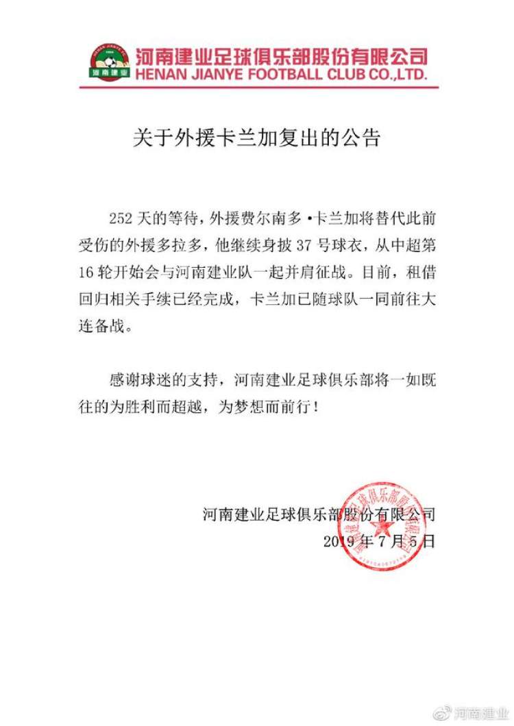 但10月29日中午,一条惊人的消息传出——卡兰加在比赛的激烈对抗中脾脏受伤,导致内出血,赛后被紧急送往医院进行了脾脏摘除手术。由于发现及时,加之手术顺利,卡兰加并没有生命危险。不过,卡兰加的上赛季征程也因此提前结束。手术过后,卡兰加进去了漫长的恢复期。这一等,就是将近一个赛季。本月6日,河南建业发布公告宣布卡兰加正式复出顶替赛季首轮受伤的多拉多。