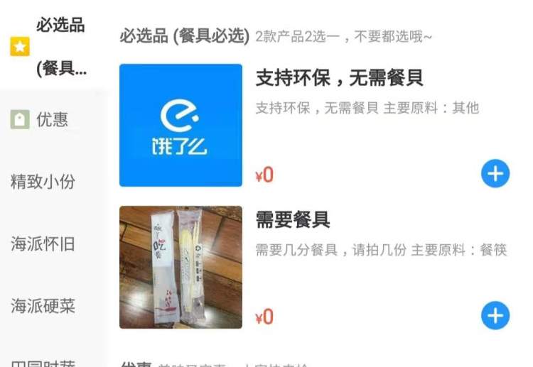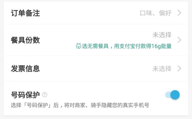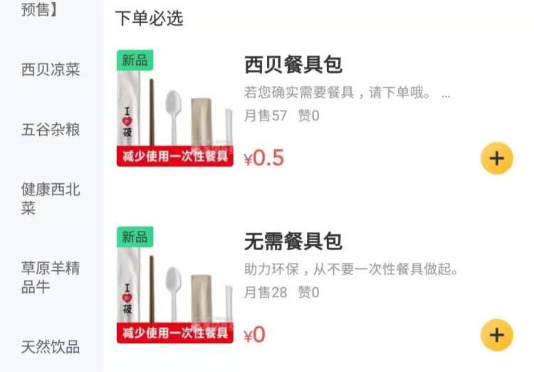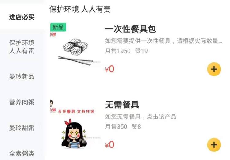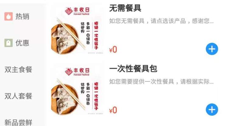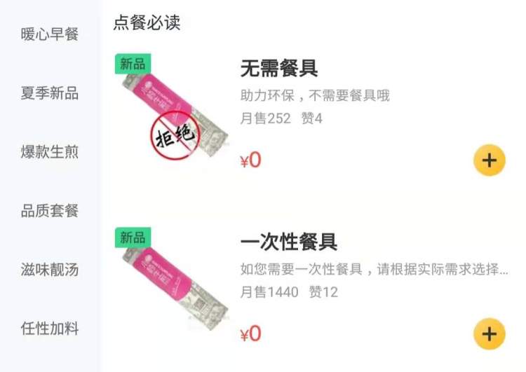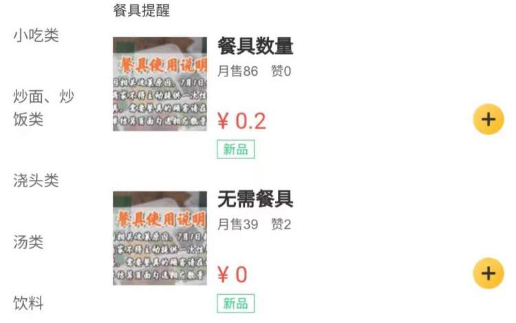 有的店即使没有宣传横幅、公告,菜单栏里也未单独列出餐具选项,但在最后的付款页面,平台系统会提示是否需要餐具,如选择需要也是免费的。
