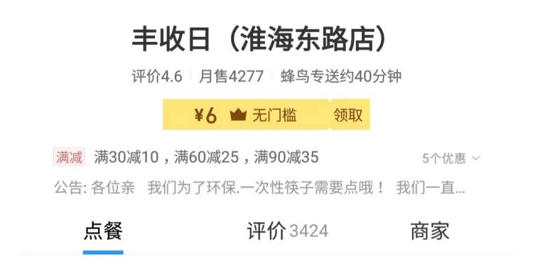 丰收日(淮海东路店)在公告处提示一次性筷子需要特别点击索取。