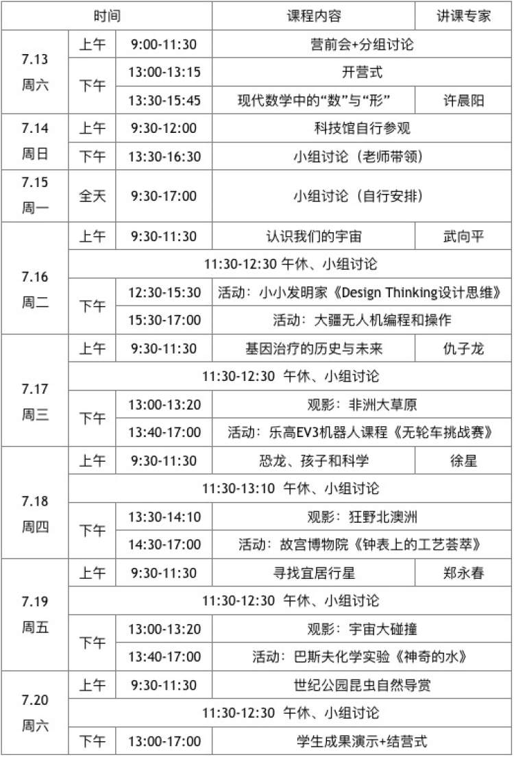 在为期七天的科学营中,营员们将在专家讲座、互动讨论、科普影视、科学实验、野外考察、成果展示等活动环节和志同道合的小伙伴一起感受科学的奇妙与乐趣,在科学大咖与专业导师的引导下体验科研创新的魅力。