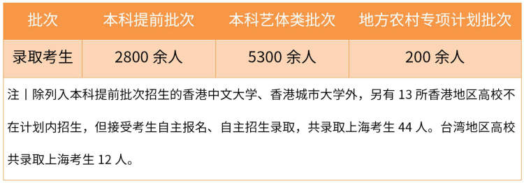 除列入本科提前批次招生的香港中文大学、香港城市大学外,另有13所香港地区高校不在计划内招生,但接受考生自主报名、自主招生录取,共录取上海考生44人。台湾地区高校共录取上海考生12人。