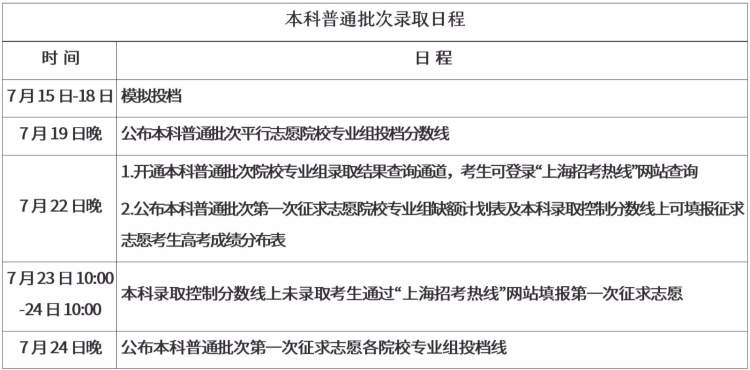 上海市高校招录下周一起开始本科普通批次录取 徐斌忠 思媛 2019-7-13 来源:周到上海 2019年上海市普通高校招生本科普通批次录取工作,将于7月15日至7月30日(含两次征求志愿)进行,该批次实行平行志愿投档。 今年共有528所院校(1070个院校专业组)参加本科普通批次招生。 为确保投档录取工作顺利,市教育考试院将组织招生院校开展模拟投档,并于7月19日正式投档,当晚公布本科普通批次各院校专业组投档分数线。招生院校将按照公布的《招生章程》进行专业录取。 本科普通批次具体录取日程如下: 来源:周到上海 作者:徐斌忠 思媛 赞一个 (0)
