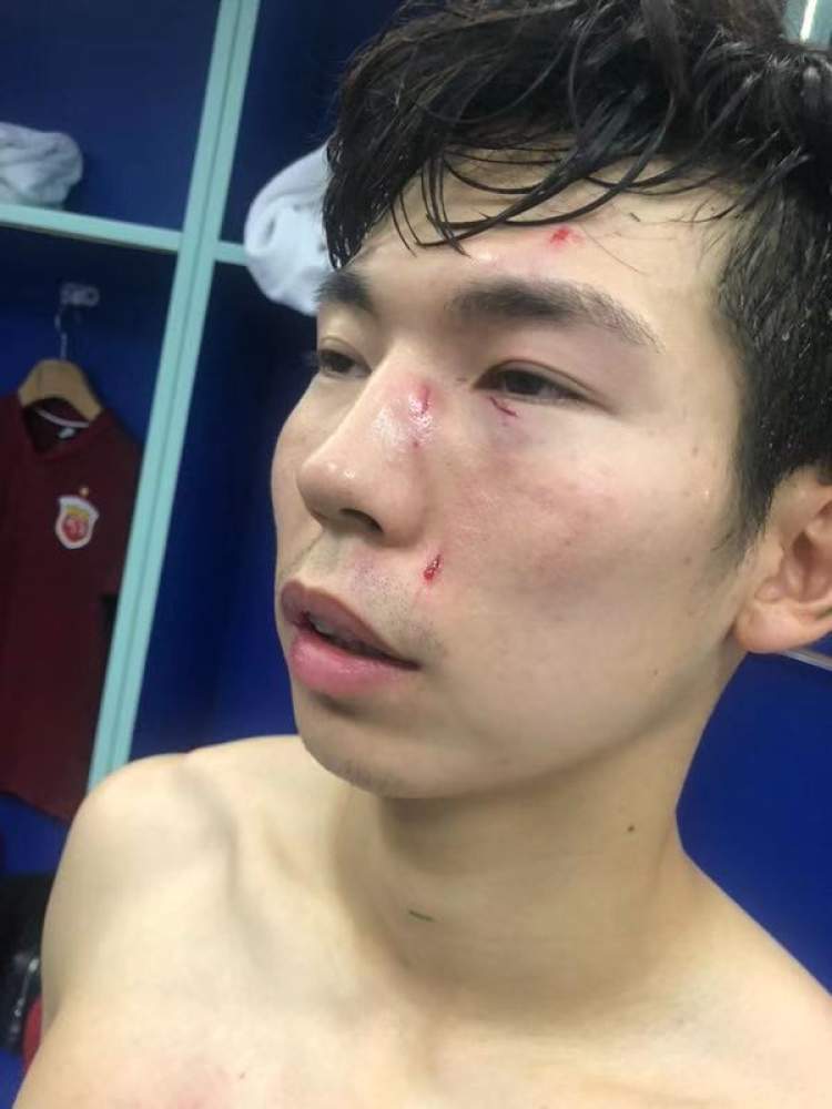 杨世元不但脸部被踹出伤口,连球衣胸前的位置都被钉鞋直接撕开,胸前踩出的红印也是清晰可见。无法坚持比赛的杨世元被蔡慧康换下。
