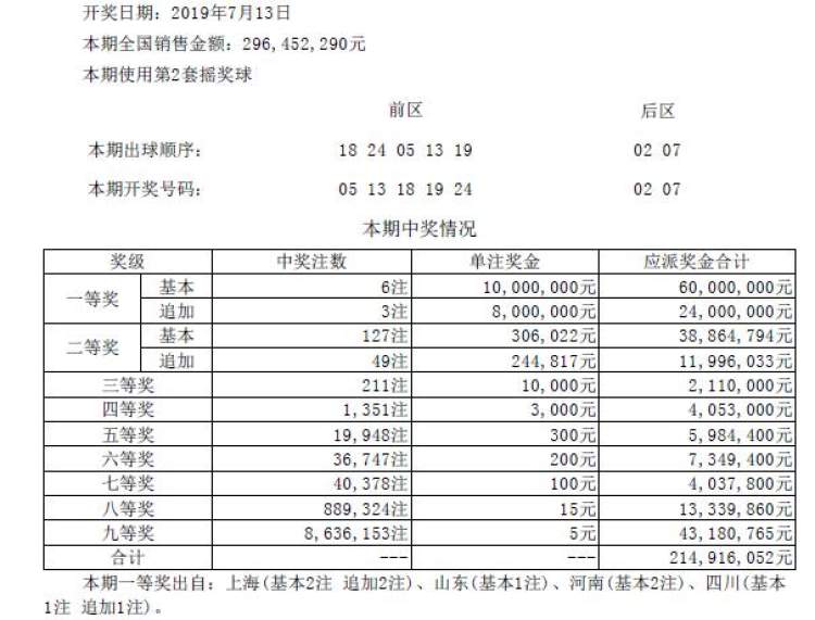 7月13日,体彩大乐透第19080期开奖,前区开出号码“05、13、18、19、24”,后区开出号码“02、07”。
